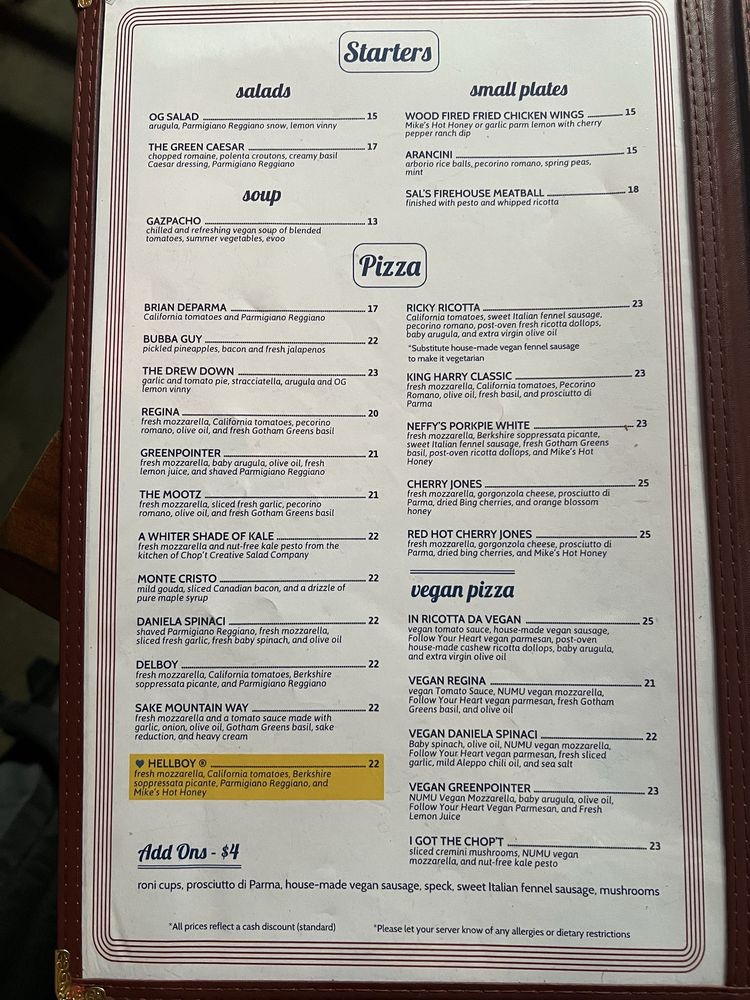 Paulie Gee’s is a bustling pizzeria located in Brooklyn, NY, offering a variety of Neopolitan pizzas made with crispy crusts and flavorful toppings. Customers rave about favorites like the Hellboy, featuring hot honey and arugula salad, and the Bubba Guy with Italian sausage. The menu also includes unique options like the Cherry Jones, a sweet and savory pie with gorgonzola and cherries. The cozy yet lively atmosphere is perfect for groups, and the attentive service ensures a pleasant dining experience. Vegan and vegetarian options are plentiful, and the cocktail and wine selection adds to the overall enjoyment. With options for outdoor seating and private dining, Paulie Gee’s caters to a diverse range of customers. Overall, the combination of delicious pizzas, friendly service, and inviting ambiance makes Paulie Gee’s a must-visit for pizza lovers.